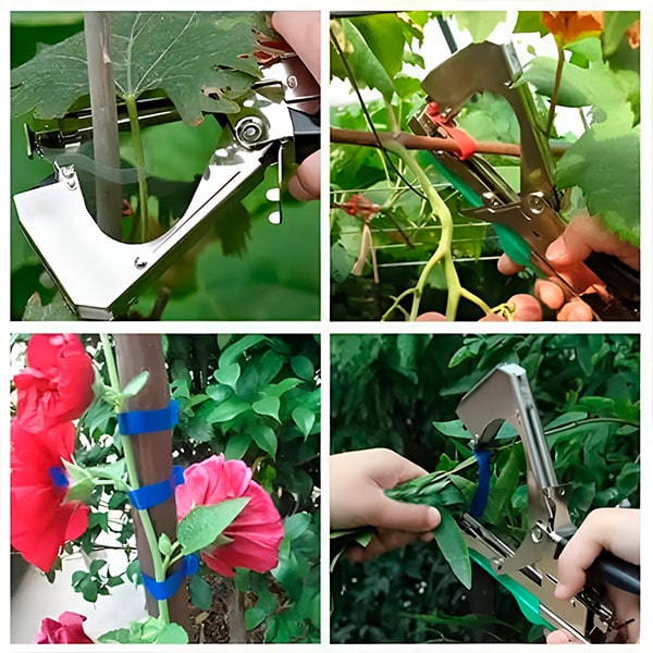 Просто натиснете дръжката, за да опънете лентата между щипките. След това лентата се увива около растението, което искате да завържете. Натиснете отново дръжката, за да затегнете и отрежете лентата. Много лесно! – без притеснения, че ще повредите вашите растения или ще им причините болка, тъй като лентата и телбодът осигуряват нежно, но здраво захващане.