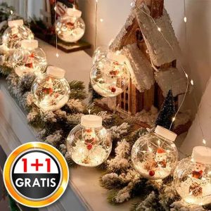 Прозрачните топки съдържат симпатични фигурки, изкуствен сняг, шишарки и LED светлини.