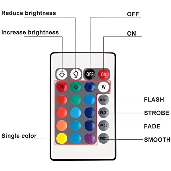 AQUASHEIN се предлага с удобно дистанционно управление, което ви позволява да регулирате осветлението с лекота. С 24 бутона можете да избирате от 16 RGB цвята и четири динамични режима (светкавица, стробоскоп, избледняване, плавно). Контролирайте осветлението от разстояние до 10 метра, като си осигурите безпроблемно персонализиране.