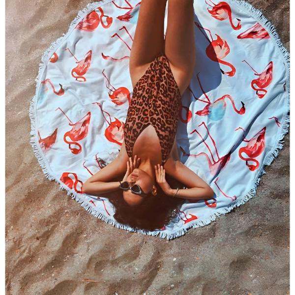 Кръглата кърпа е предназначена за релаксация на плажа или край басейна, но може да се носи и завързана около тялото като дреха.